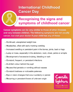 Learn more about spotting the early symptoms of childhood cancer, and treatments, by visiting https://www.candlelighters.org.uk/support-for-families/about-childrens-cancer/